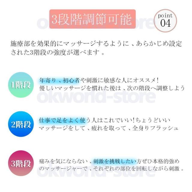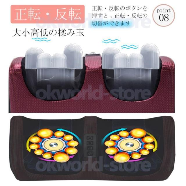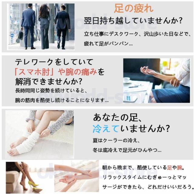 3WAY使い方/20個揉み玉/温熱ヒーター機能/コリに合わせた3段階強度レベル/じんわり温める/足裏、ふくらはぎ、腕などをマッサージする/手揉みのような絶妙/足を包み込むように立体的に配置される/両方向揉めマッサージ/毎日の疲れを癒す/収納ラクラク/軽量設計/操作簡単/静音設計