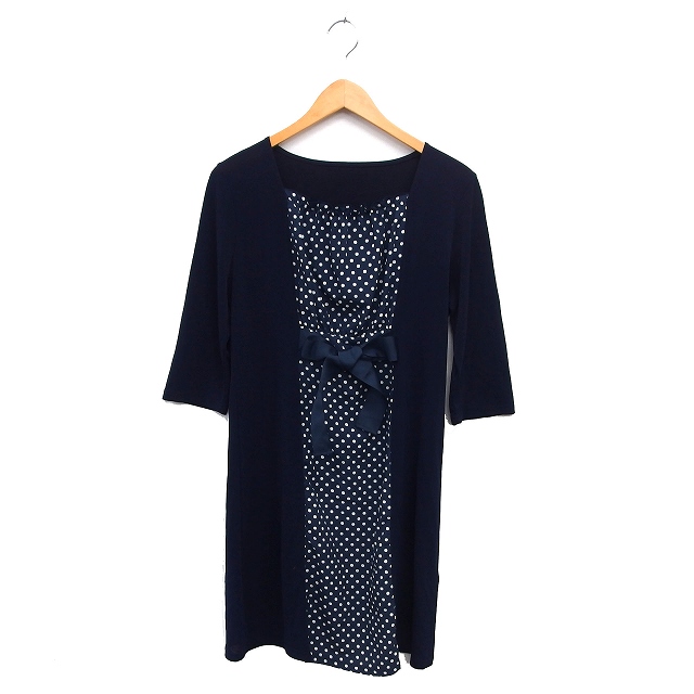 【中古】ドルチェ Dolce フレア ワンピース ひざ丈 水玉 リボン 透け感 ギャザー 七分袖 紺 ネイビー /NT27