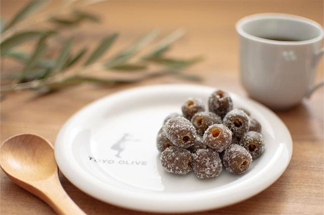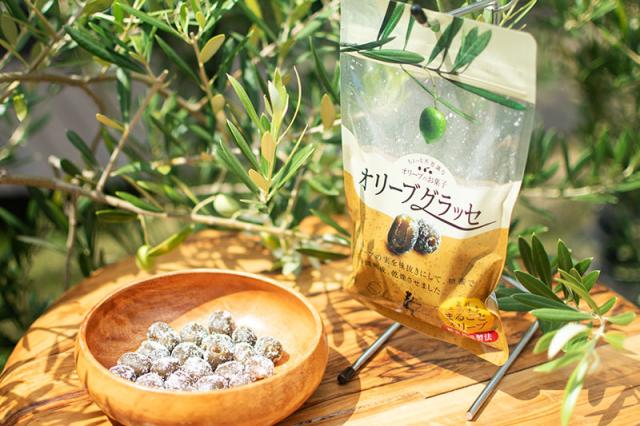オリーブグラッセはオヒブランカ種を使用することで、何度でも口に運びたくなる、ちょうどよい食感のお菓子になりました。