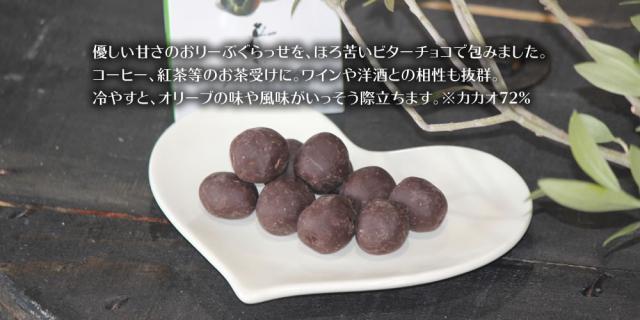 優しい甘さのおりーぶぐらっせをほろ苦いビターチョコで包んだお菓子「おりぐらっちょ」です。