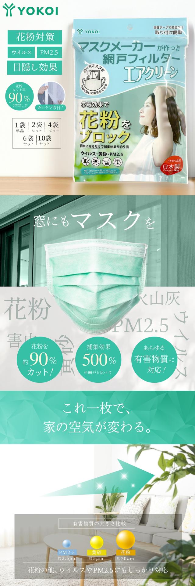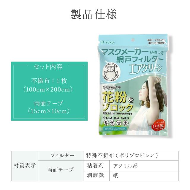 網戸用花粉フィルター 網戸用フィルター マスクメーカーが作った 網戸フィルター エアクリーン 花粉症対策 エアクリーン 長さ 200cm×幅100cm 4袋セット 網戸 窓 両面テープ付 窓 花粉 黄砂 PM2.5 帯電フィルター ヨコイ YOKOI 日本製