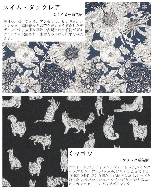 | カラー | Aオレンジ系パッチワーク柄,Bライトピンク系花柄,Cネイビー系花柄,Dブラック系猫柄 |