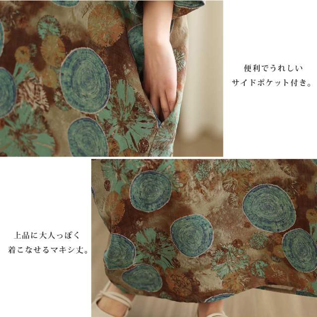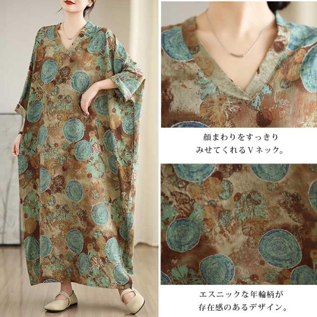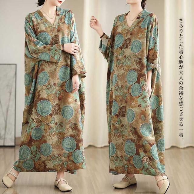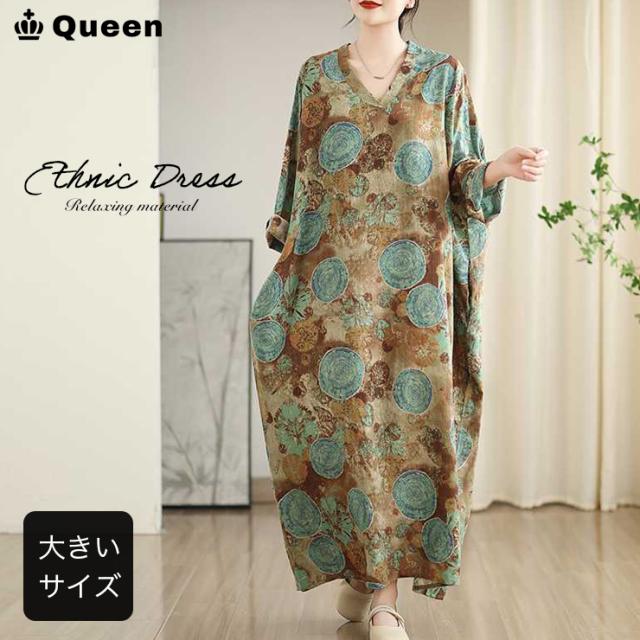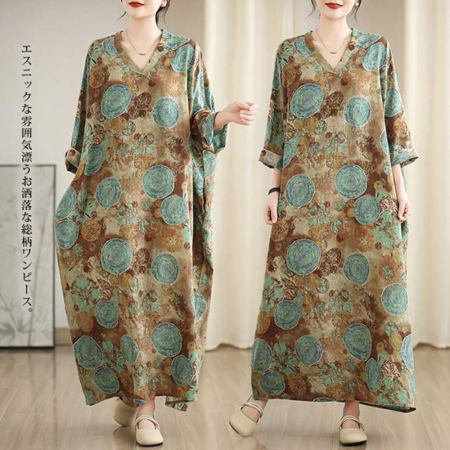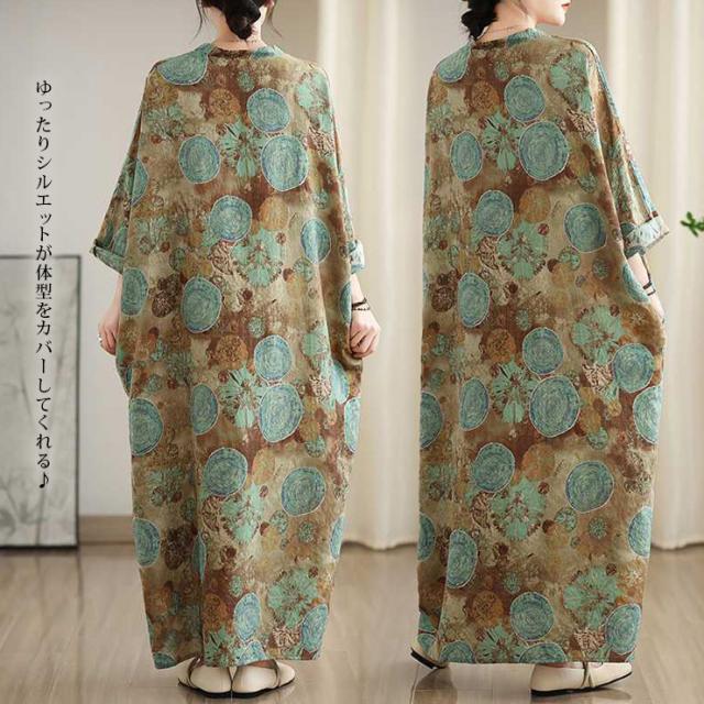 ワンピース 長袖 大きいサイズ レディース ワイドワンピ マキシ丈 総柄 和風 ボヘミアン 薄手 春 夏 秋 (249740)