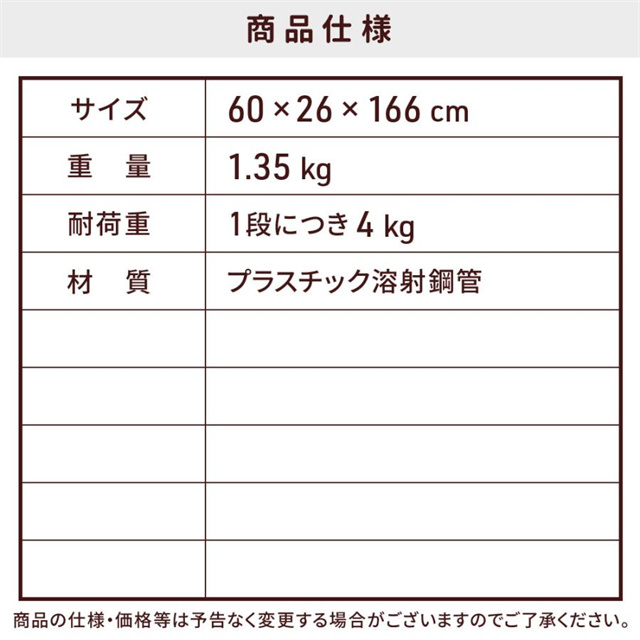 耐荷重:4kg(1段あたり)