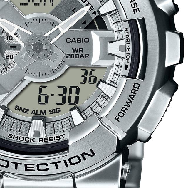 そのアイコニックなスタイルで人気モデルのひとつであるビッグケースのアナログ・デジタルコンビネーション、「110シリーズ」のベゼルとバンドを金属素材にアップデートしたGM-110です。