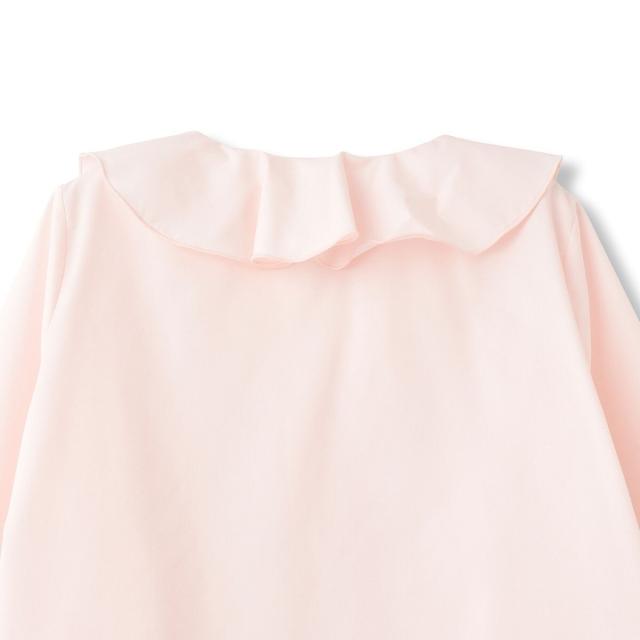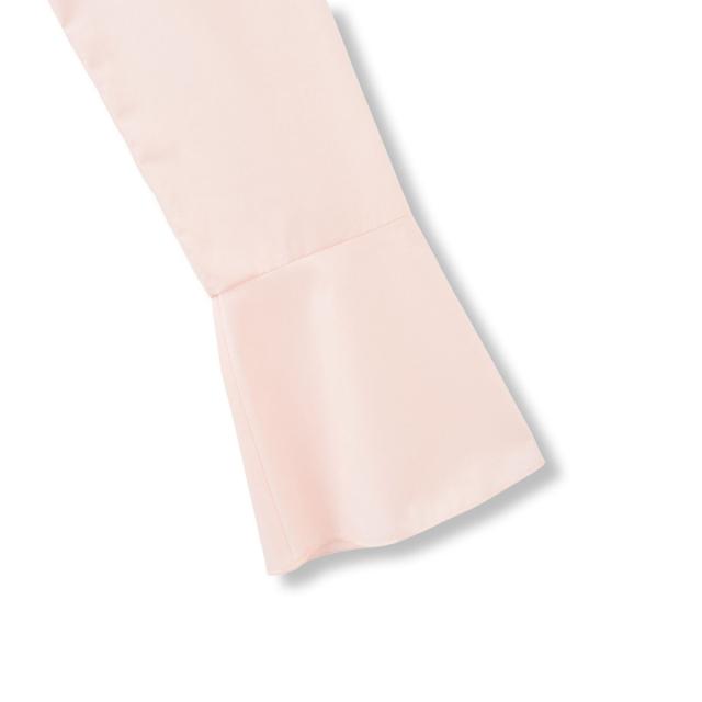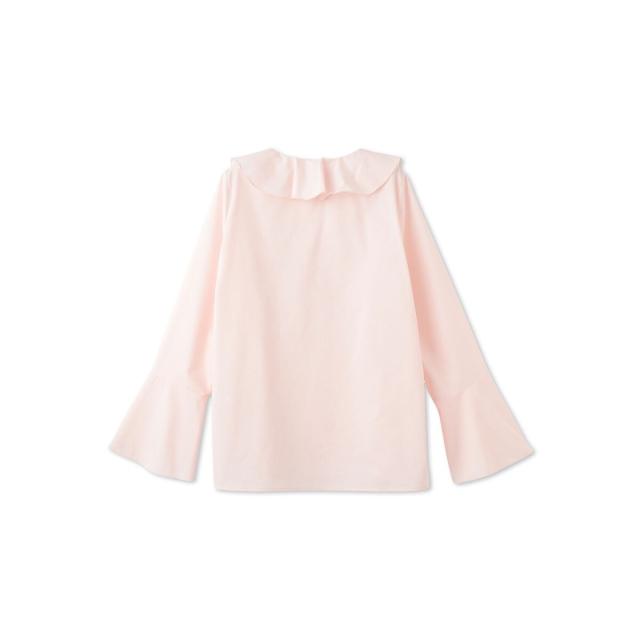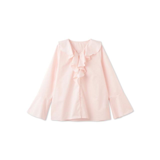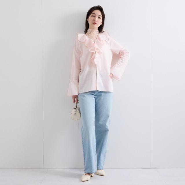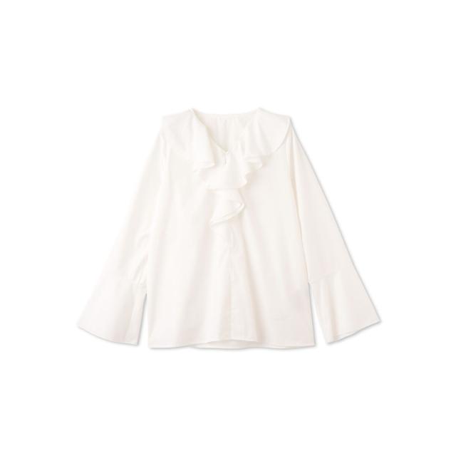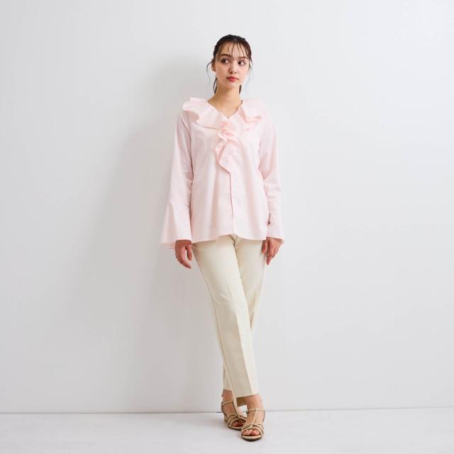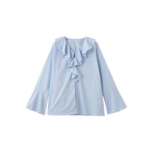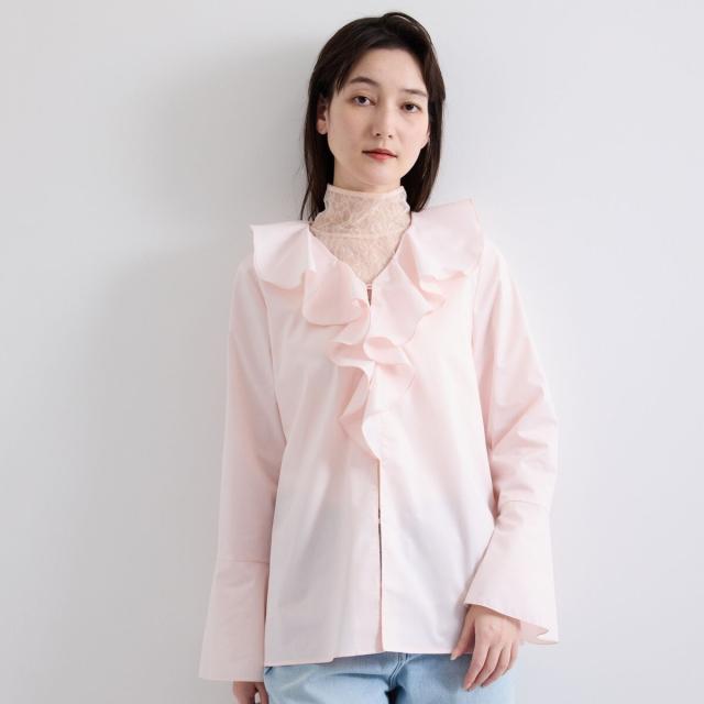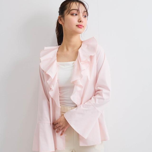 フロントのラッフルデザインが印象的なフレアスリーブのブラウスはプルオーバーとしてもシャツアウターとしても着用が可能なデザインです。