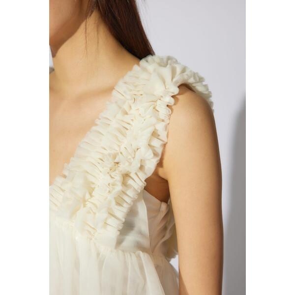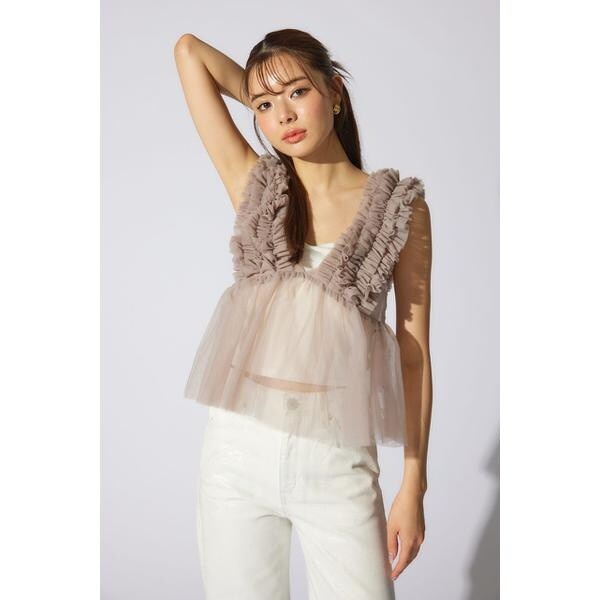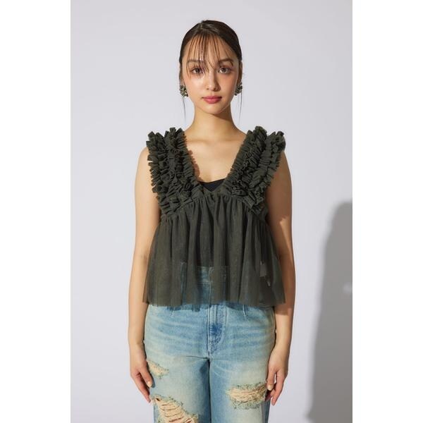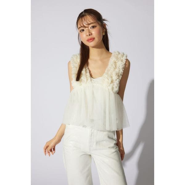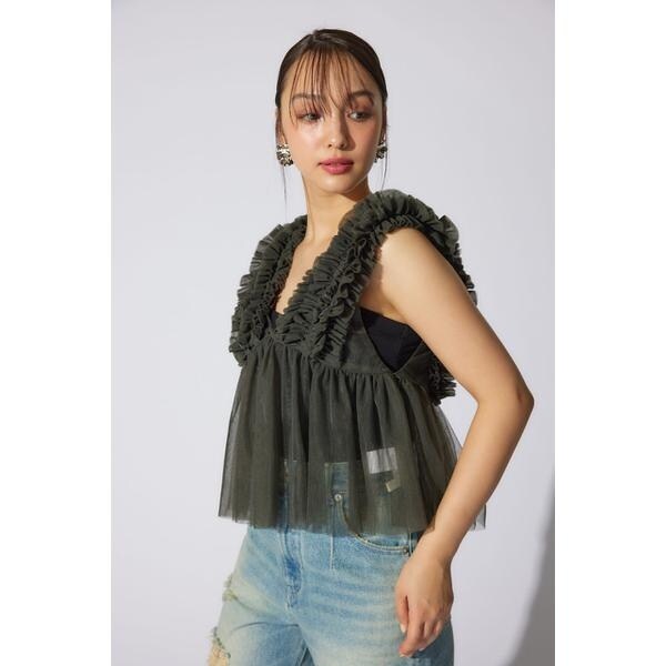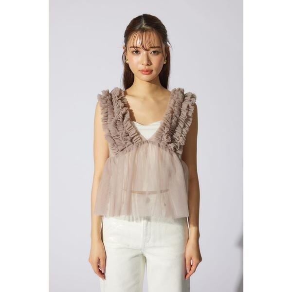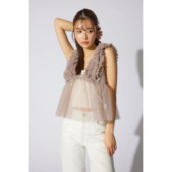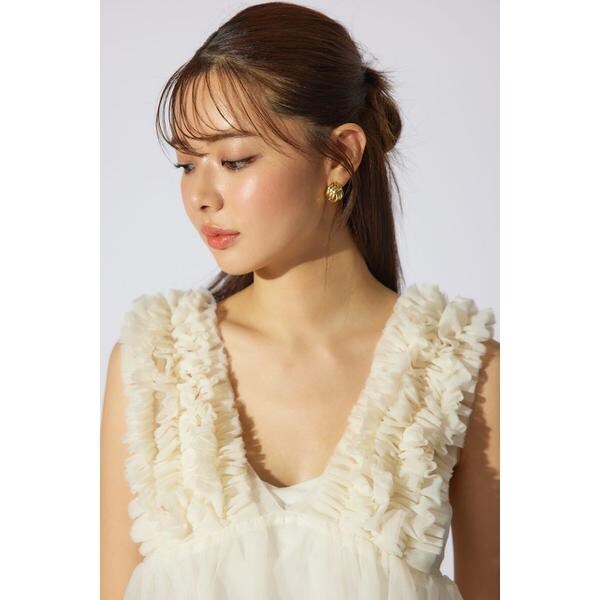 【チュール素材で作った大人可愛いアイテム】■ポイント土台のチュールに沢山のギャザーを入れたフリル布を立体的に叩きつけたビスチェ。■ディテールウエストから下に程よいギャザーを入れて大人可愛いデザインに拘りました。■スタイリング夏は半袖Tシャツの上に、冬はロンTやタートルネックの上に重ねて着れる1年中活躍するアイテム。■生地透け感:あり光沢感:なし伸縮性:なし裏地:なし■商品のお気に入り登録お気に入りアイテムの再入荷・在庫1点などの通知を受け取ることができます。[注意事項]※画像の商品はサンプルです。実際の商品と仕様、加工が若干異なる場合があります。※画像の商品は光の照射や角度、お使いのモニター環境により、実物と色味が異なる場合がございます。※着用、お取り扱いの際は、アテンションタグをご確認ください。
