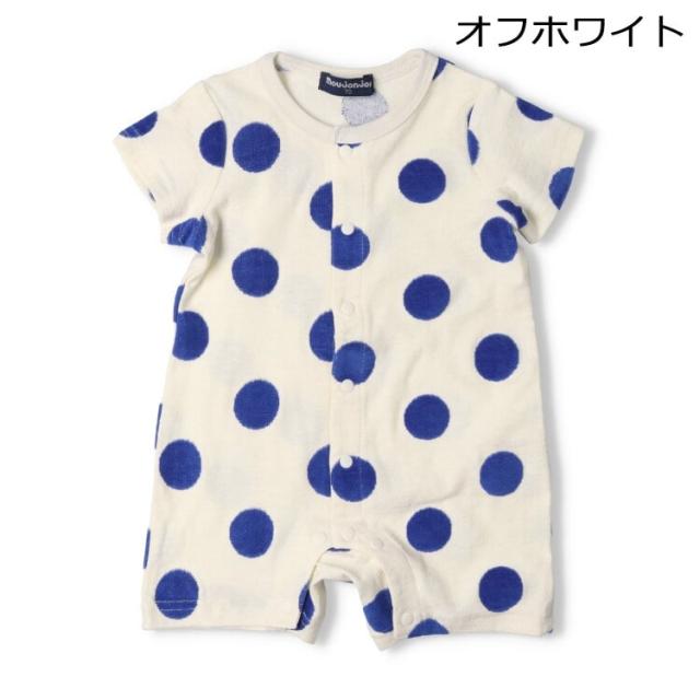 水玉部分が立体になった素材を使用した半袖の前開きロンパース、Tオール。夏のお出かけにオススメなアイテム。同じドット柄のTシャツ(M34800)、ワンピース(M44301)、チュニックTシャツ(M44800)の作りもあるので、兄弟姉妹やお友達と男女でアイテム違いでペア、リンクコーデ、お揃い、おそろいコーディネートも楽しめます!【アイテム】プレゼント ギフト 赤ちゃん服 ベビー服 贈り物 トップス ボトムス つなぎ カジュアル お洒落 オシャレ かわいい 可愛い 普段着 デイリーウェア お出かけ着 ロンパース Tオール 子ども こども 男児 男の子 ボーイズ キッズ ベビーサイズ 幼稚園 保育園通園 2025年春夏物新作 丸高衣料 水玉 オフホワイト 白色 ネイビー 紺色 ムージョンジョン 兄妹 姉弟 兄弟 姉妹 お揃い オソロ おそろい お揃いリンク リンクコーデ ペアルック