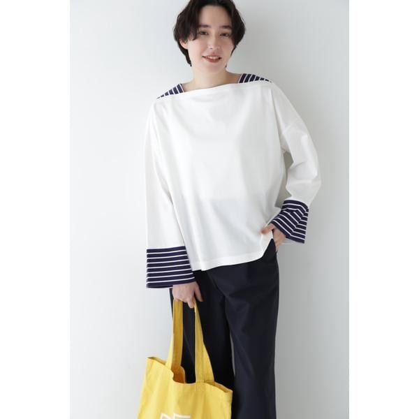 肩と袖口にあしらったボーダーがポイントのゆるめプルオーバーです。ボートネックですっきりしており、袖、裾も絶妙な太さがこなれ感があります。