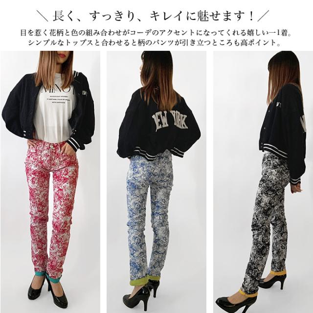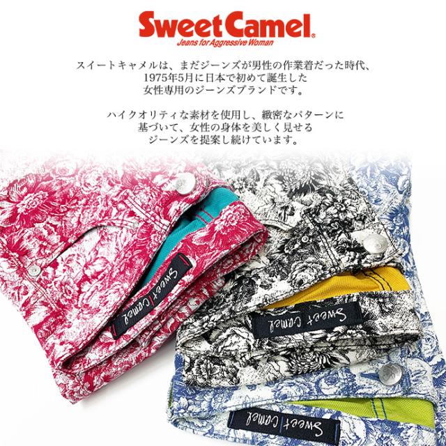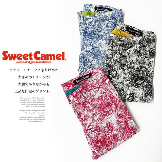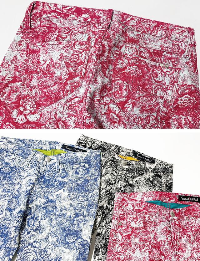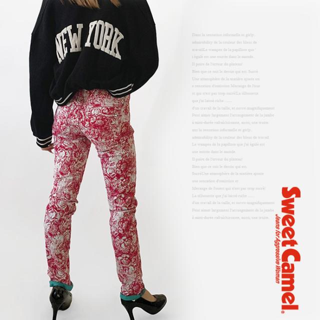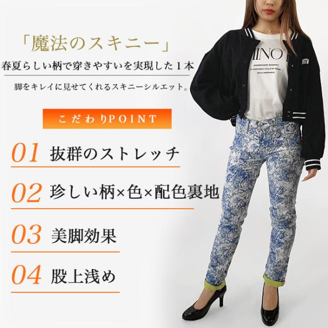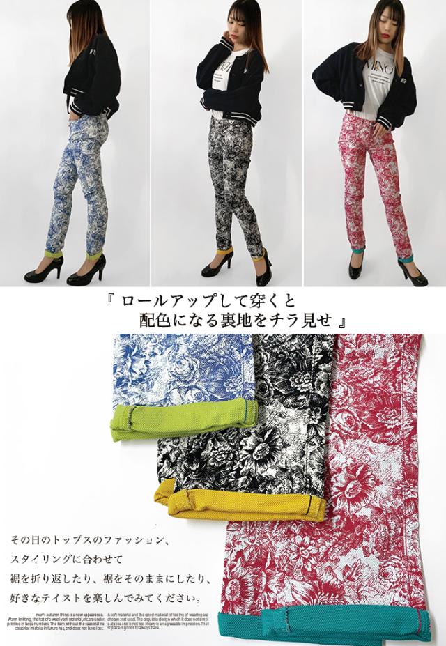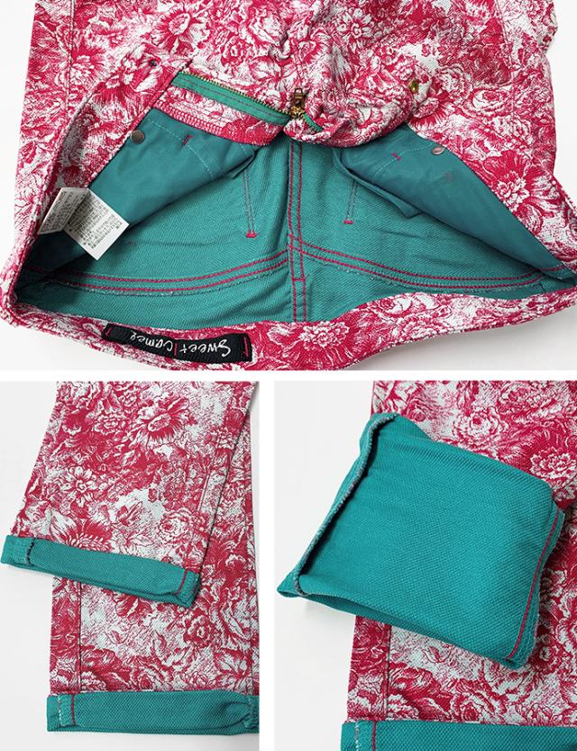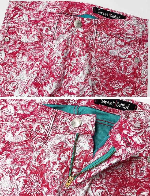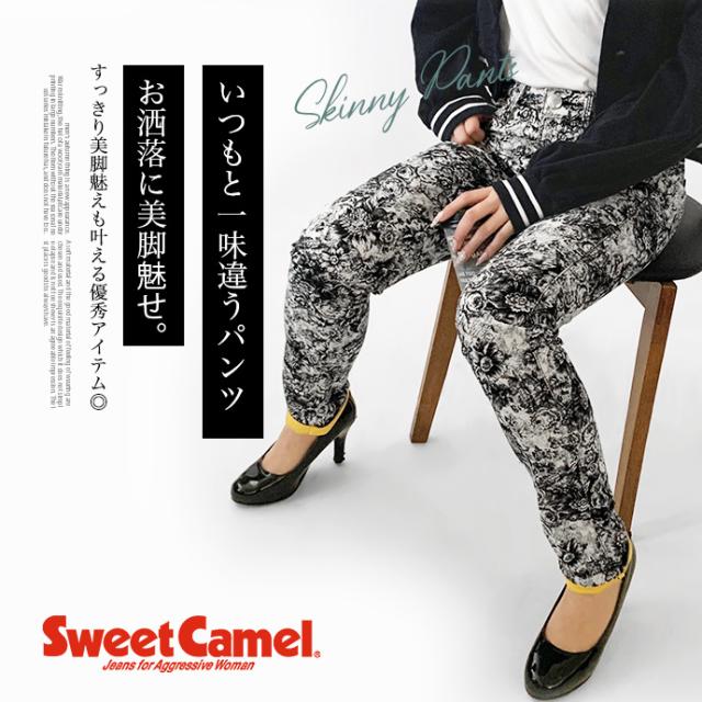スキニー パンツ 柄パンツ ボトムス ストレッチ 細身 股上浅め 小さいサイズ 美脚 脚長 大花柄 春夏 ロールアップ Sweet Camel スイートキャメル レディース 送料無料