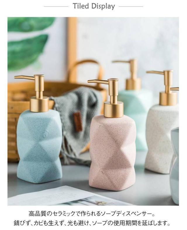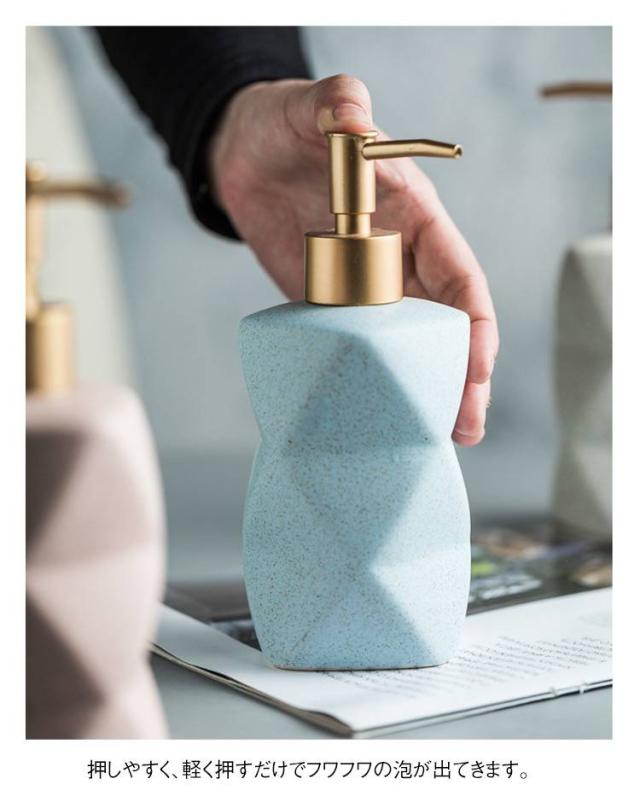 | 高品質のセラミックで作られるソープディスペンサー。 錆びず、カビも生えず、光も避け、ソープの使用期間を延ばします。 上質な質感や落ち着いた色合いと相まって、いつものサニタリーにリラックス感を演出。 押しやすく、軽く押すだけでフワフワの泡が出てきます。 ほどよい重量と安定感があり、普段使いに便利。 また大容量(約380ml)のため、頻繁に補充する必要もなし♪ 洗面台、お風呂場、台所、キッチンなどの場合に大活躍するアイテム。 | |