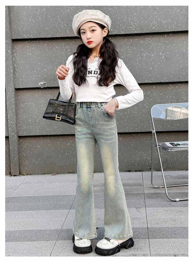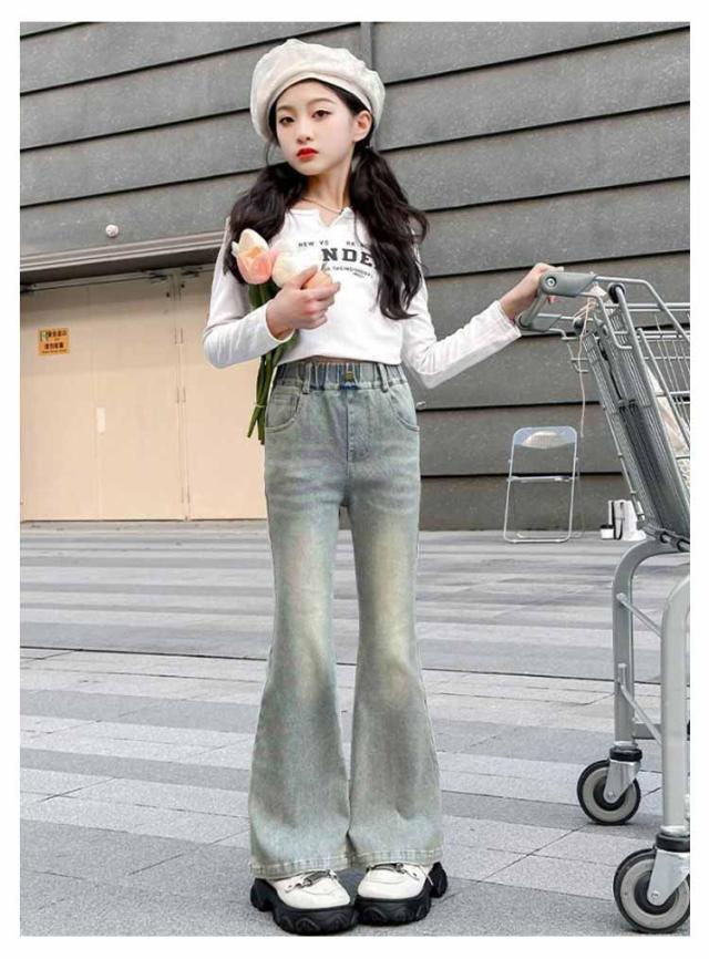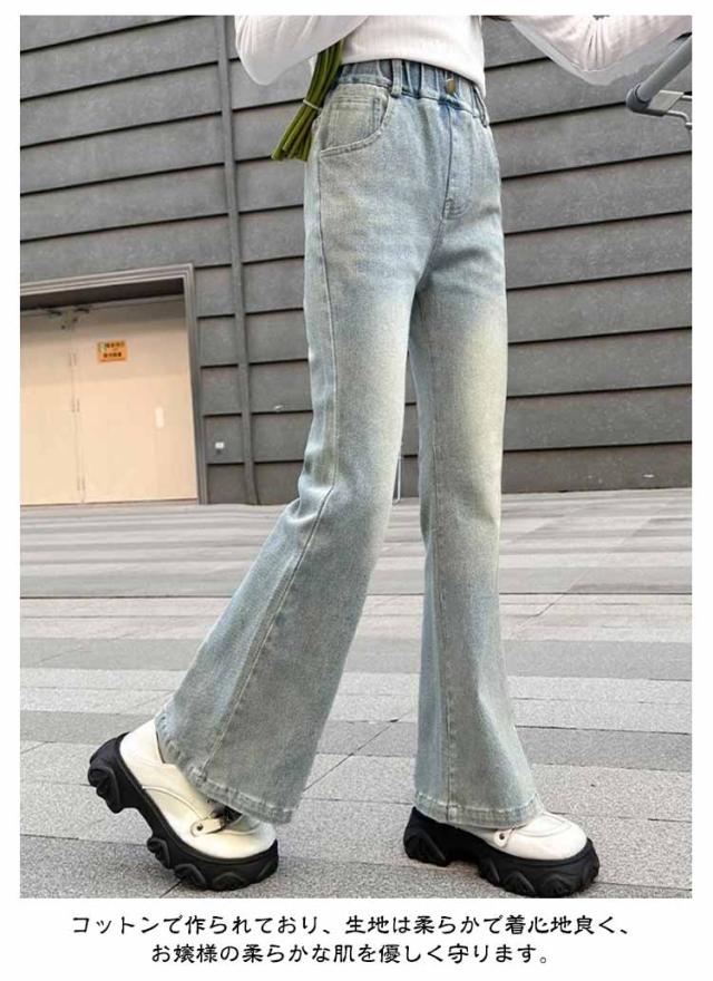 子供 デニムパンツ キッズ ジーンズ フレアパンツ ジュニア 服 女の子 ジーパン ウエストゴム ロングパンツ 小学生 中学生 秋服 韓国 ファッション ダンス 衣装 長ズボン ボトムス おしゃれ ブーツカット 120 130 140 150 160 170