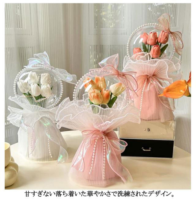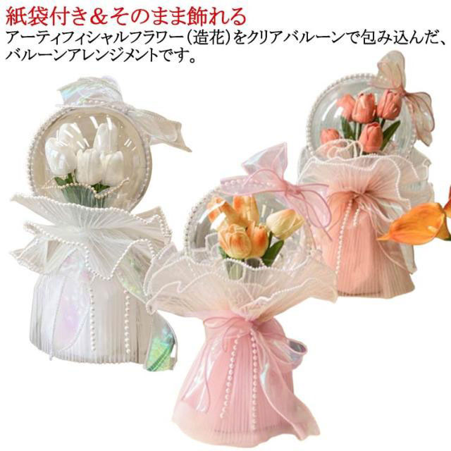 | 紙袋付き&そのまま飾れる アーティフィシャルフラワー(造花)をクリアバルーンで包み込んだ、バルーンアレンジメントです。 優しいくすみカラーのラッピングとパール付きリボンで上品に仕上げました。 甘すぎない落ち着いた華やかさで洗練されたデザイン。 お世話になった大切な方や、普段は伝えづらい身近な方への感謝の気持ちをバルーンブーケで伝えてみませんか? | |