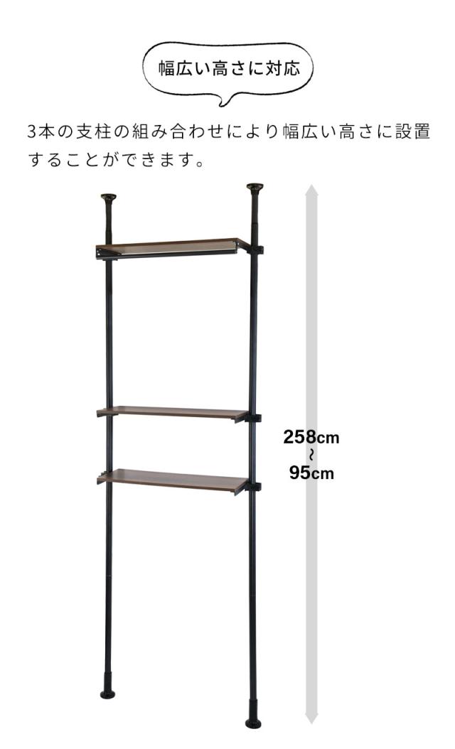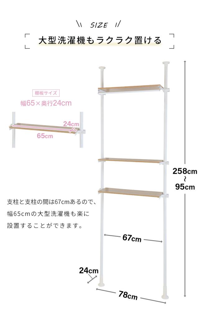 | 外形寸法:幅78×奥行24cm 設置可能高さ:95〜258cm 底面キャップ間内幅 : 62cm(設置時) 底面キャップ間外幅 : 78cm(設置時) 底面キャップ部直径 : 7.3cm |
