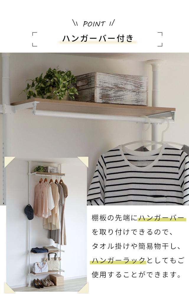 棚板の前方にハンガーパイプを取り付けできるので、タオルやバスマットを掛けたり、簡易物干しやハンガーラックとして活用OK。