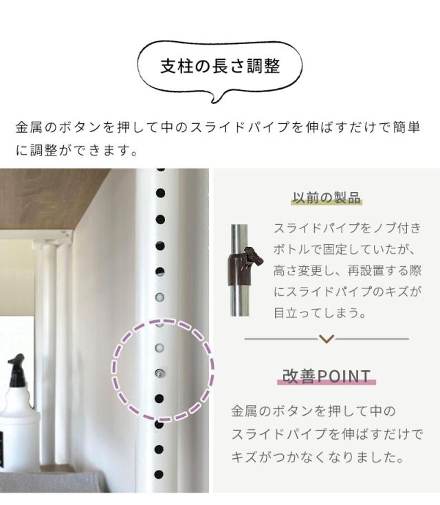 | 極太パイプ32mmΦを使用した突っ張り式ランドリーラック。 狭く、穴があけられない場所でも洗濯機を動かすことなく簡単に設置でき、洗濯機上のスペースを有効活用できます。 従来品は突っ張りパーツが天井側に付いていて脚立等がないと作業ができないという声をいただき、当製品は作業がしやすいよう床側で突っ張れるように改良しました。 一般的な縦型洗濯機やドラム式洗濯機に対応、形に合わせて棚板を調整できます。 棚板の固定方法は支柱を挟み込む方式なので、支柱にキズがつきず、収納するモノに合わせてお好きな高さに無段階で設置できます。 棚板の前方にハンガーパイプを取り付けできるので、タオルやバスマットを掛けたり、簡易物干しやハンガーラックとして活用OK。 ランドリーラックとしての使用以外にも、トイレラックやウォークインクローゼットなどでとしてもご使用いただけます。 |