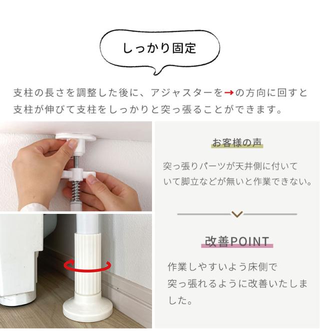 従来品は突っ張りパーツが天井側に付いていて脚立等がないと作業ができないという声をいただき、当製品は作業がしやすいよう床側で突っ張れるように改良しました。