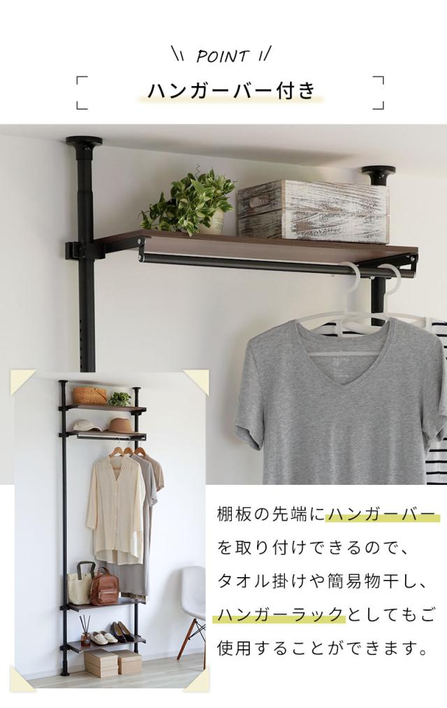 棚板の前方にハンガーパイプを取り付けできるので、タオルやバスマットを掛けたり、簡易物干しやハンガーラックとして活用OK。