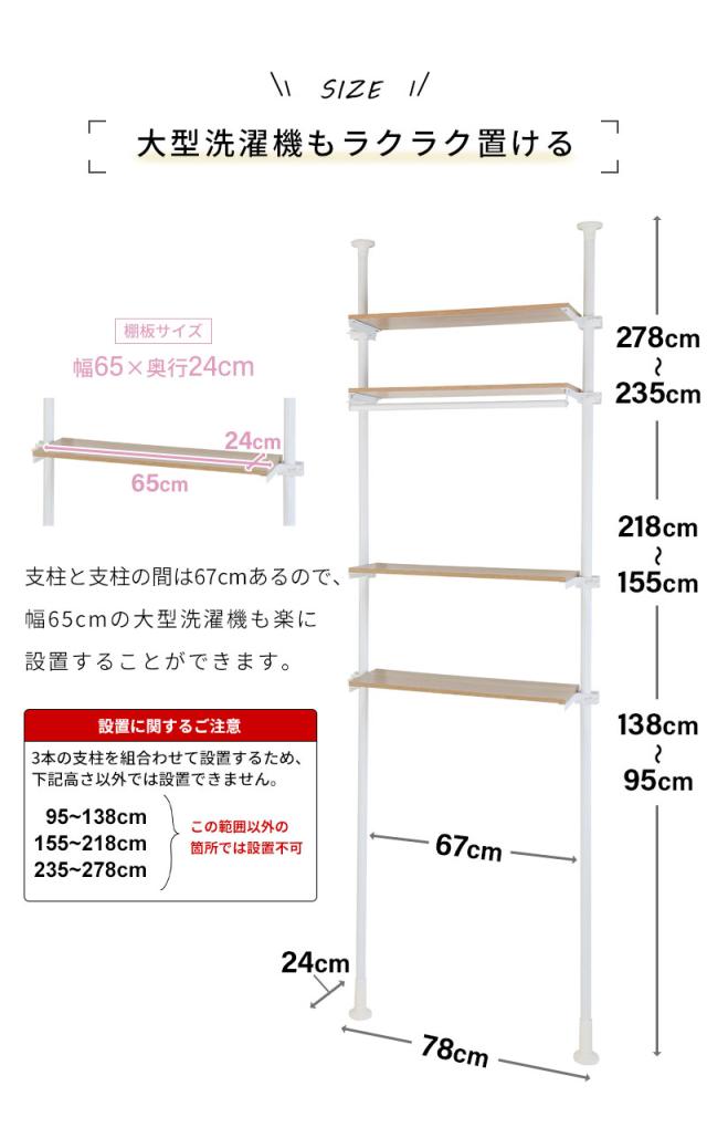 | 外形寸法:幅78×奥行24cm 設置可能高さ:95〜138cm・155〜218cm・235〜278cm 底面キャップ間内幅 : 62cm(設置時) 底面キャップ間外幅 : 78cm(設置時) 底面キャップ部直径 : 7.3cm |