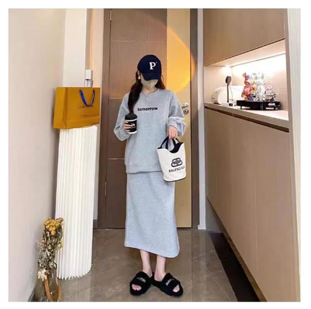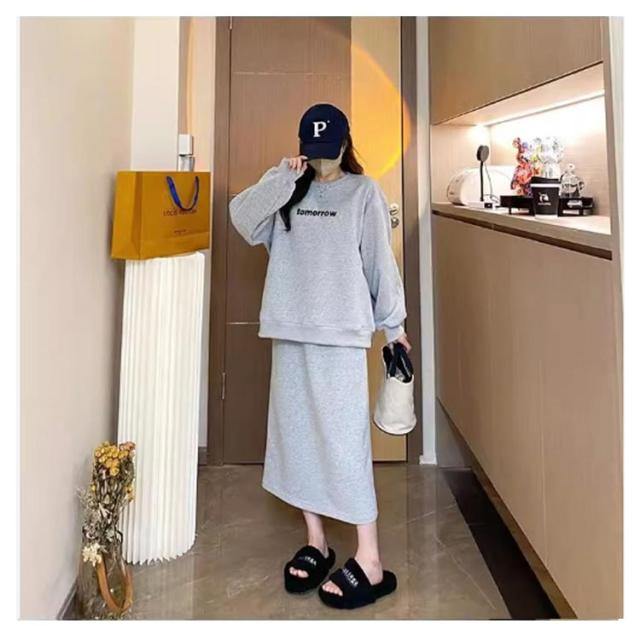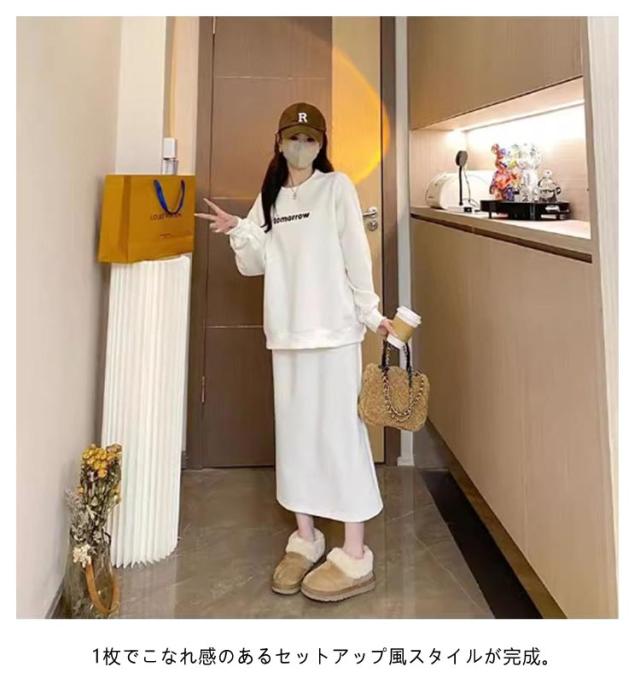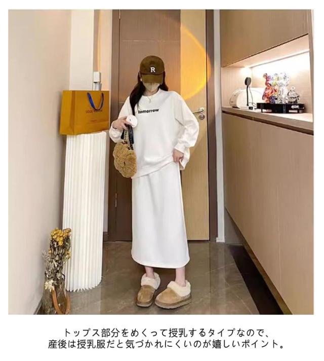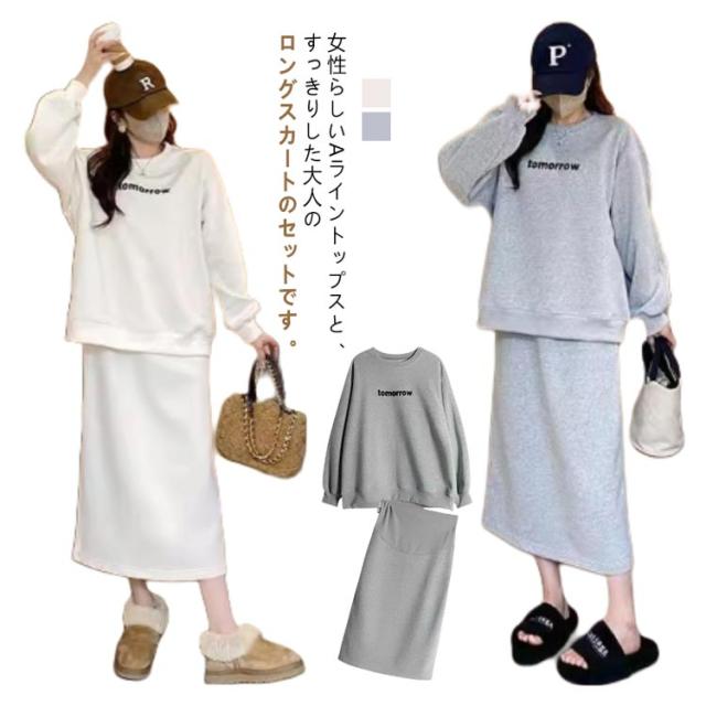 プルオーバー スカート セットアップ マタニティ 春秋 トレーナー カットソーセットアップ風ワンピース 産後 授乳服 オフィス 通勤 お出かけ カジュアル おしゃれ 大人 トップス スカート お宮参り 長袖 通勤 膝丈 膝下 上下セット M L XL 2XL 3XL 送料無料