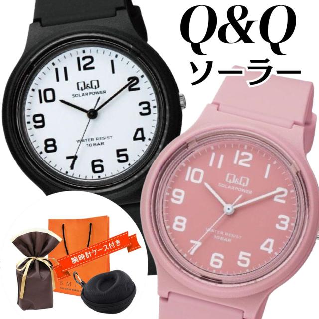 ラッピング済 ギフトセット ブラック ピンク ペアウォッチ ソーラー シチズン Q&Q 腕時計 電池交換不要 10気圧防水 手提げ紙袋つき 時計ケース付 シンプル デザイン 海 山 川 キャンプ 一緒に使える お揃い カップル 家族 両親 記念日 誕生日プレゼント 成人 卒業 入学