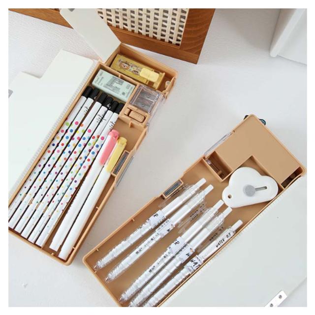 | 両面開きで使いやすいボックス型筆箱。 スリムなのにたっぷり収納できちゃうのが嬉しい♪ 消しゴム用スペースには、取り外しのできる鉛筆削り器が付属しているので、削りカスを捨てるときも簡単便利♪ オモテ・ウラどちらの扉も、開閉が楽ちんなマグネット式。 しっかり閉まるから、文房具がこぼれ落ちず安心。 | |