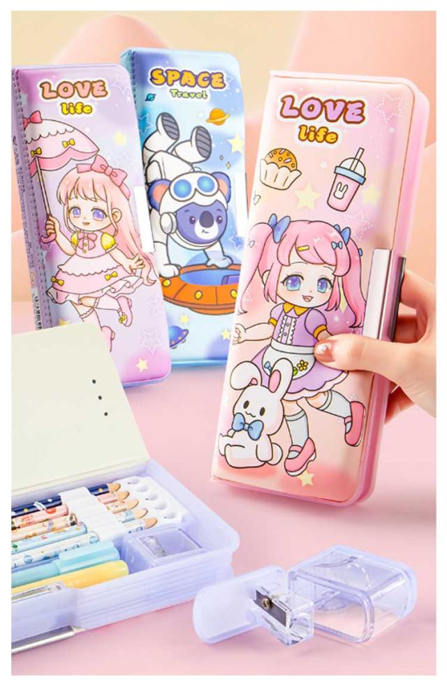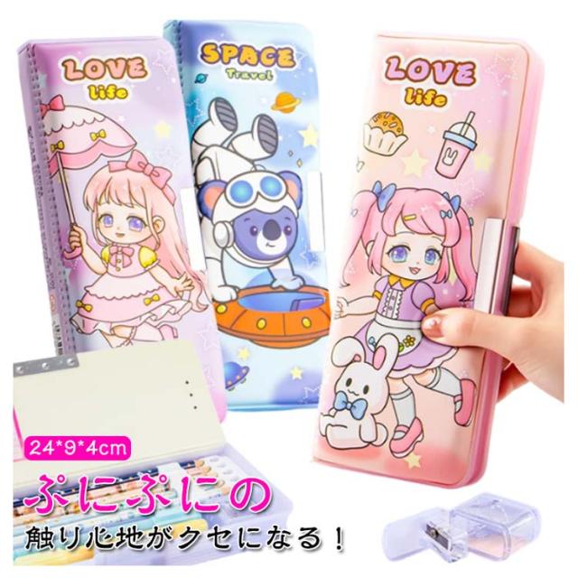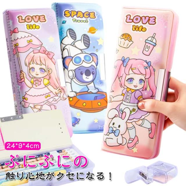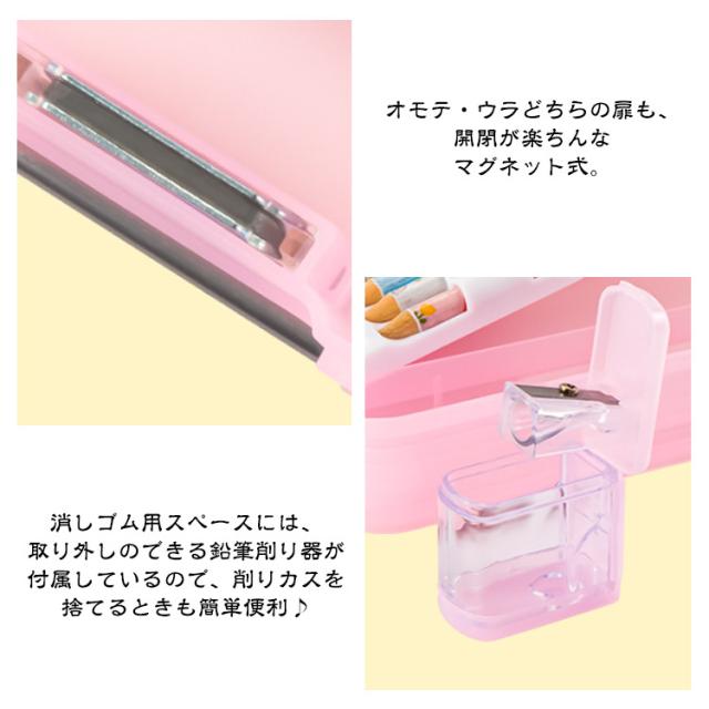 | ぷにぷにの触り心地がクセになる!両面開きで使いやすいボックス型筆箱。 スリムなのにたっぷり収納できちゃうのが嬉しい♪ 消しゴム用スペースには、取り外しのできる鉛筆削り器が付属しているので、削りカスを捨てるときも簡単便利♪ オモテ・ウラどちらの扉も、開閉が楽ちんなマグネット式。 しっかり閉まるから、文房具がこぼれ落ちず安心。 | |