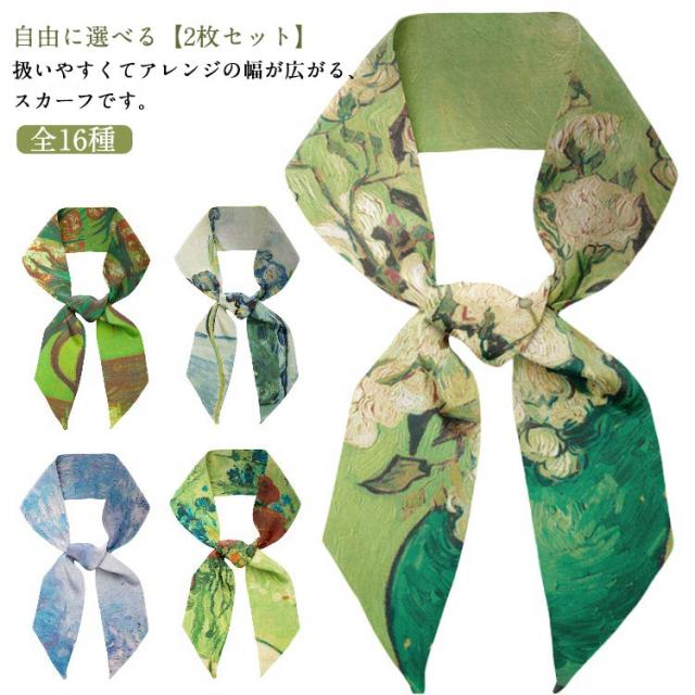 モネ シルク調 制服 マルチ 絵画 ゴッホ リボン 16種 ロングスカーフ ネックスカーフ アレンジ自在 スカーフ 舞台 アクセサリー ボータイ ボウタイ 衣装 入学式 結婚式 冠婚葬祭 ヘアアレンジ 【2枚セット】 フラワー 花柄 空 睡蓮
