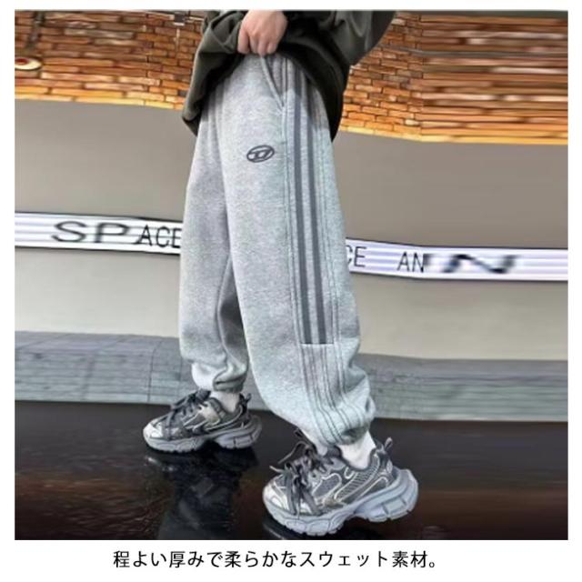 | 120〜170cm!サイドラインがポイントのスウェットパンツ ゆったり幅とウエストゴムでリラクシーなはき心地。 程よい厚みで柔らかなスウェット素材。 通園通学にも、リラックスしたいおうち時間にも活躍。 | |