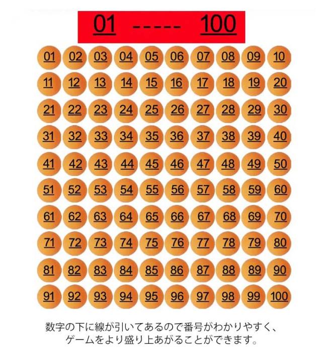 | 1から100の数字が印字されているカラフルなピンピン玉。 数字の下に線が引いてあるので番号がわかりやすく、ゲームをより盛り上あがることができます。 ビンゴゲームやくじ引きや抽選会に大活躍する定番のナンバー入り抽選ボールです。 | |
