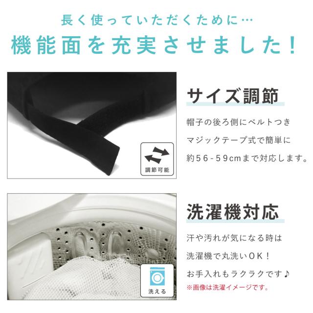 マジックテープ式サイズ調節ベルトで約56-59cmまで簡単に調節可能