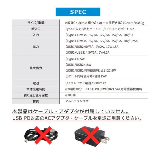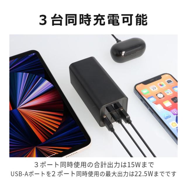 最大出力:(Type-C)65W、(USB1/USB2)18W、(USB1/USB2同時使用時)合計22.5W(3ポート同時使用時)合計15W