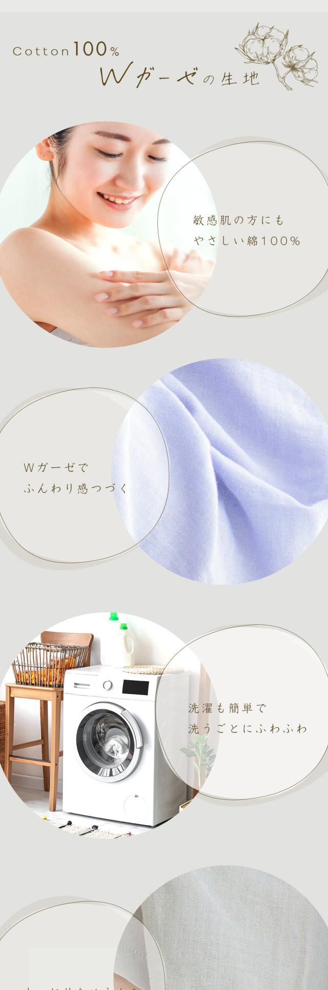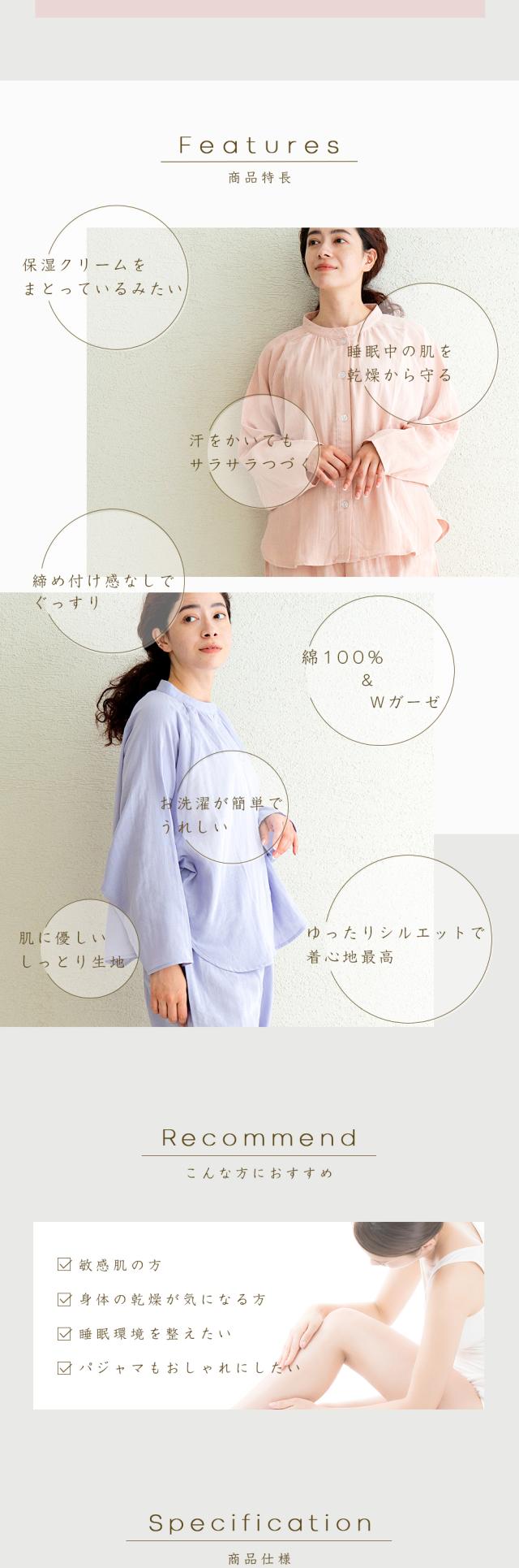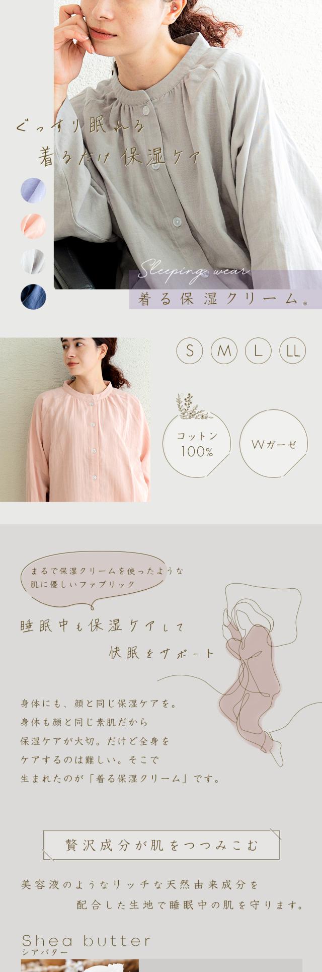 ダブルガーゼ生地の優しい着心地。綿100%。着るだけで保湿ケア。