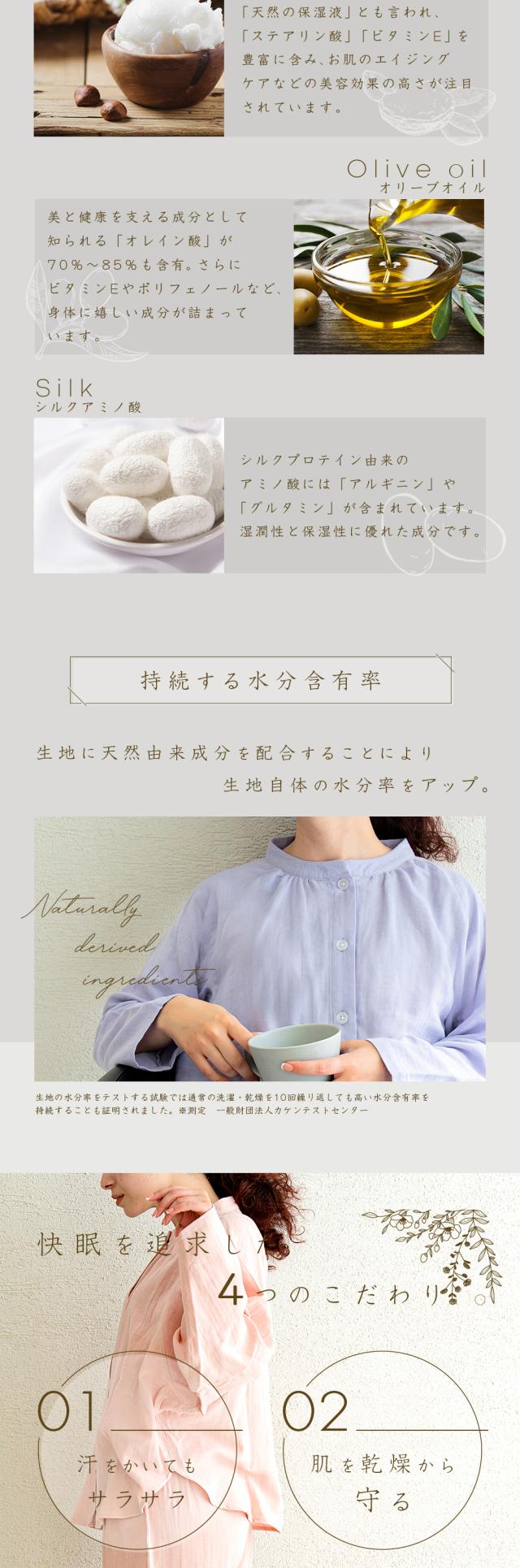 | 商品特長 | 1、【天然由来成分】 "シアバター/オリーブオイル/シルクアミノ酸の贅沢成分を生地に配合。 綿100%のWガーゼ生地もお肌に安心です。" 2、【吸湿性】 "人は就寝後に汗をかく事で体温を調整し深い眠りにつくことができます。 吸湿性がある素材は就寝中も快適な眠りをサポートします。" 3、【水分保有率】 "快適な睡眠環境は就寝中のエアコンなどによる乾燥から肌を守ることが大切です。 水分率の高い生地を使用し包み込むような着心地と軽やかさを感じて下さい。" 4、【スリープセレモニー】 "就寝前にパジャマを着る行動は脳のスイッチを睡眠モードに切り替える効果があると言われています。 リラックスしたシルエットで肌触りのいいパジャマを着用する事でスリープセレモニーをより印象付けてくれます。" |