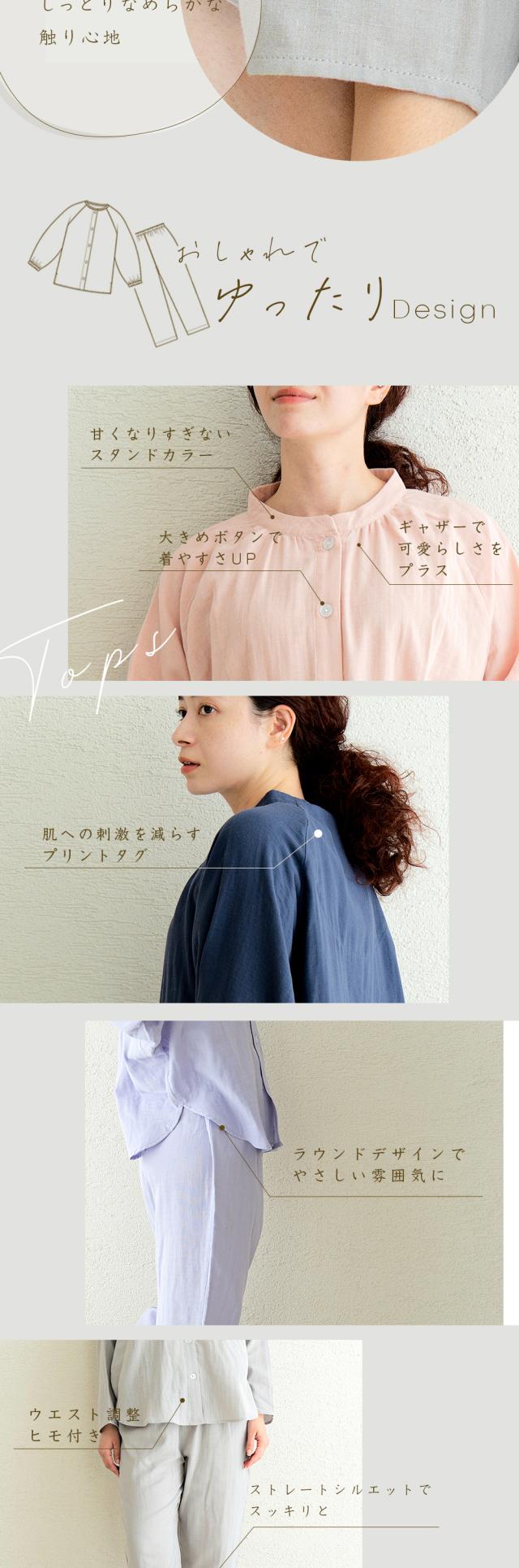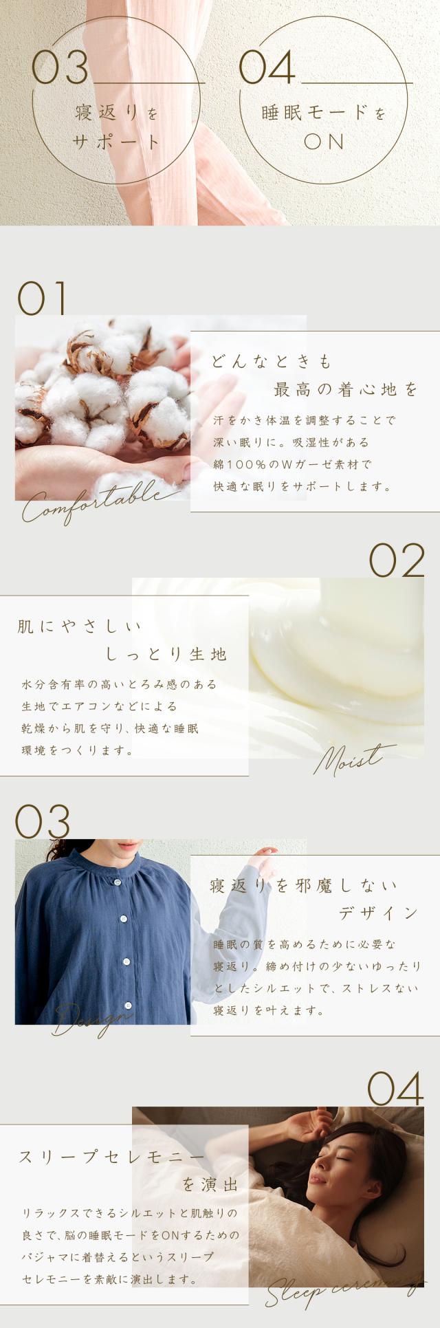 しっとりやわらかな綿100%のガーゼに天然由来成分をプラスしたスリーピングウエアです。睡眠中の肌を乾燥から守り、ゆったりシルエットでストレスのない寝返りをサポートします。