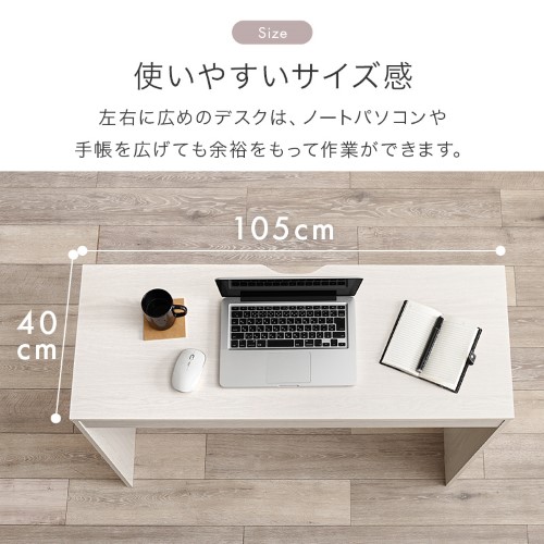 | サイズ(cm) | デスク:(約)幅105×奥行40×高さ75cm、ラック:(約)幅59×奥行35×高さ63.5cm、チェスト:(約)幅40×奥行35×高さ63.5cm |