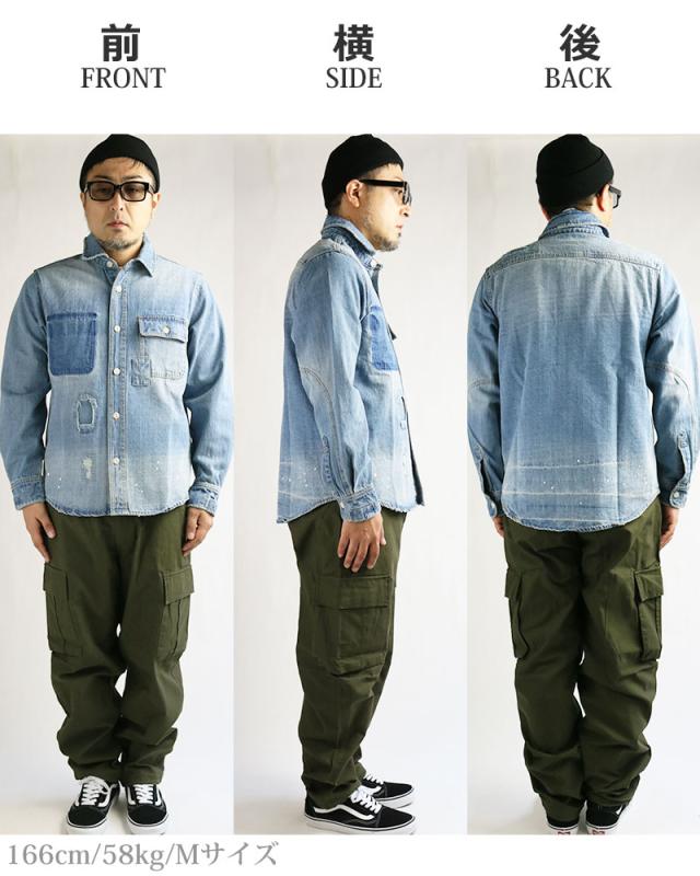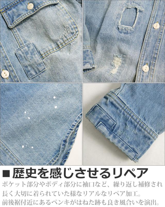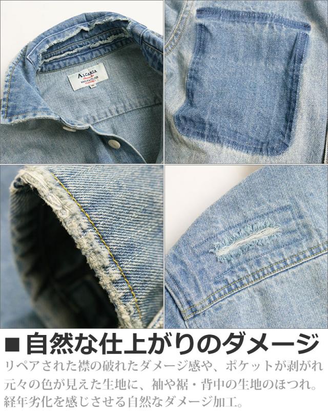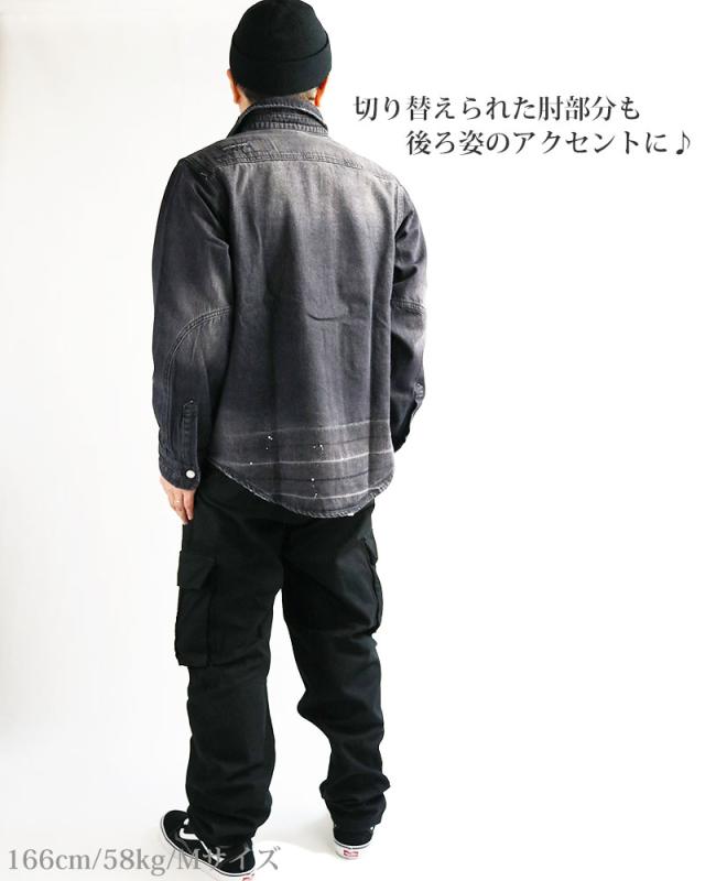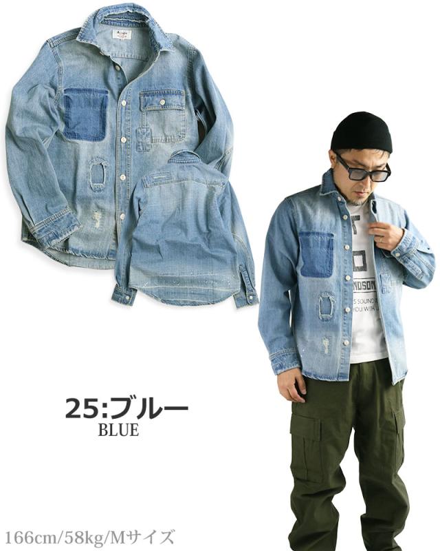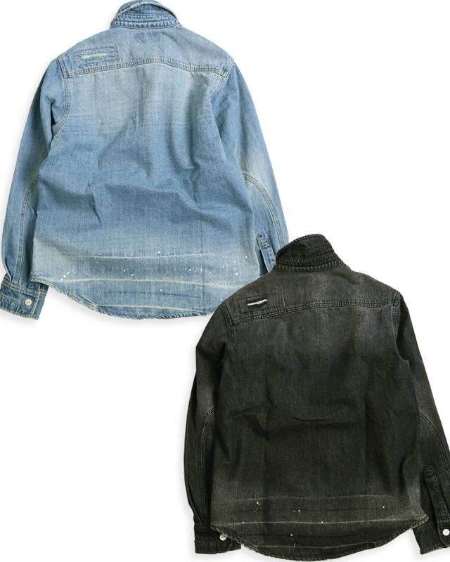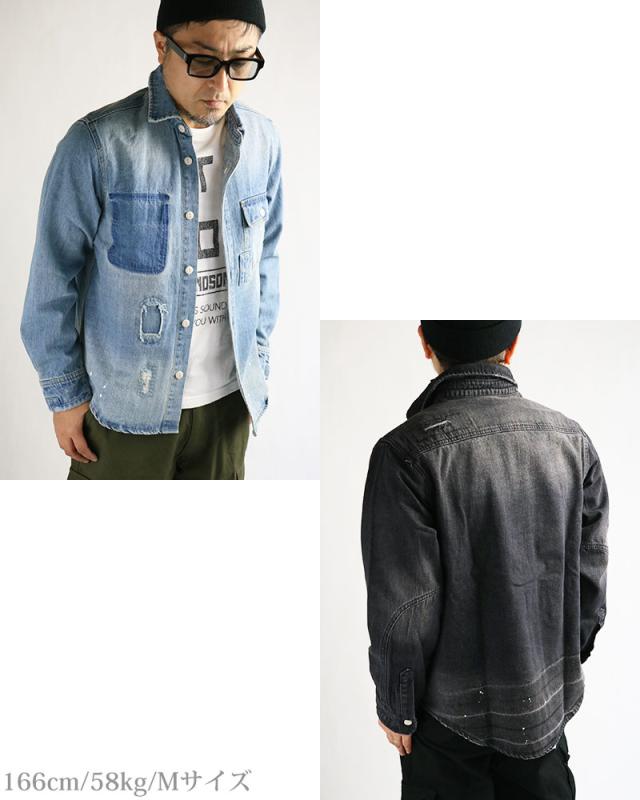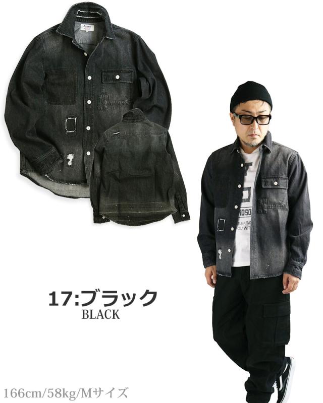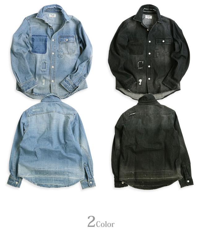 デニムシャツ メンズ 長袖 リペア ダメージ ペンキ ペイント 長袖シャツ ワークシャツ アメカジ ブルーデニム ブラックデニム ALCARZA アルカーザ 黒 青