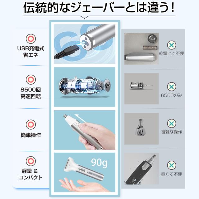 便利なUSB充電式電動シェーバーで、国内も海外も使用可能で使用時間がもっと長くなり、省エネになりました。ヘッド部分は取り外しがやすいし、使用後、水洗い可能です。なお、付属の清掃用ブラシを使って、内側のムダ毛を掃き出します。
