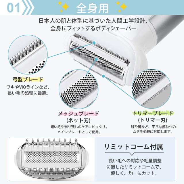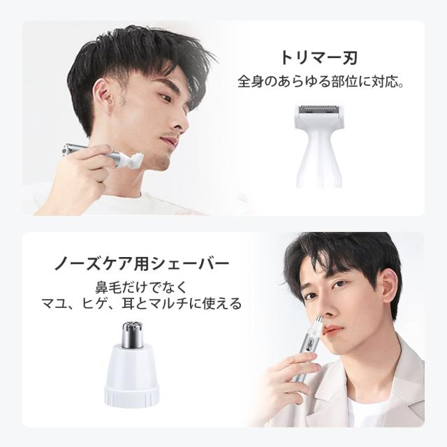 顔、産毛、眉毛、脇、腕、足、下の毛、鼻毛、耳毛等全身用電気シェイバーで、ムダ毛の悩みから解放させる5in1必要品です。