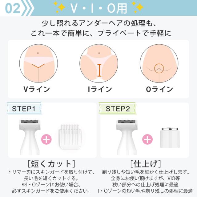 VIO専用シェーバーも用意しており、もっと衛生的です。最適な専用刃で、VIO特有の太くて長い毛もしっかりキャッチ、チクチク剃り残しなくカットできます。シェーバー刃とスキンガードを組み合わせて、様々なアンダーヘアの形を好みにシェービングできます。