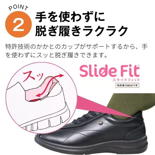 スライドフィットシューズは、かかとのカップがサポートすることで、手を使わずスッと脱ぎ履きができるスライドフィットを搭載。
