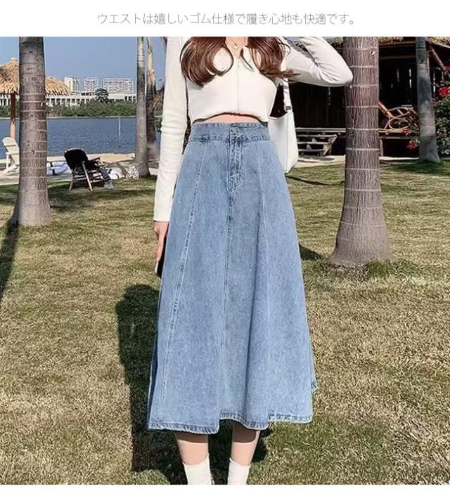 デニムスカート フレアスカート ロング スカート Aライン ウエストゴム レディース カジュアル
