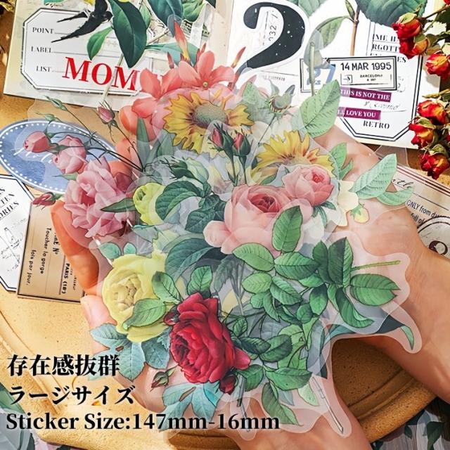 クリアシール 大きめ ラージサイズ 薔薇 ローズ 向日葵 椿 紫陽花 花柄 数字 英語 文字 チケット 切符 タグ ダメージ イラストシール 40枚 異素材 コラージュ素材 おしゃれ PETシール 耐水シール 半透明シール デコレーション インテリア ハンドメイド 手帳 DIY
