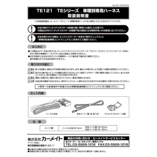 エンジンスターター オプション ハーネス TEシリーズ 車種別専用ハーネス トヨタ ダイハツ カーメイト TE121