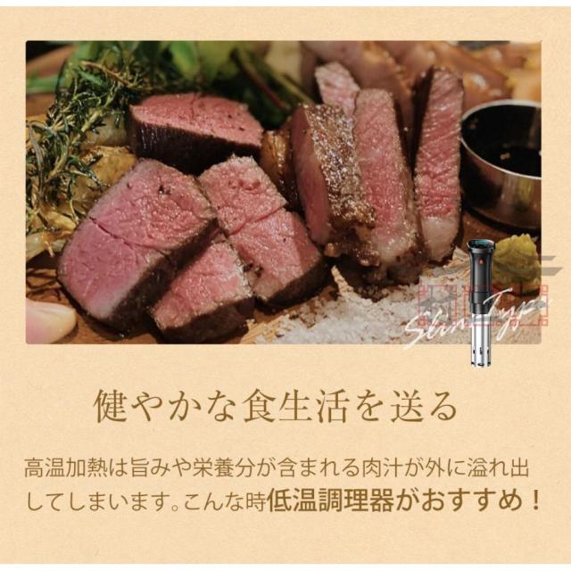 鍋に水を入れて低温調理器をセットし、食材と調味料を入れた袋を入れるだけ。 低温で調理することで、肉のタンパク質の凝固や水分の蒸発を防ぐため、やわらかいローストビーフやパサパサ感のないサラダチキンなどを味わえるのが魅力です。