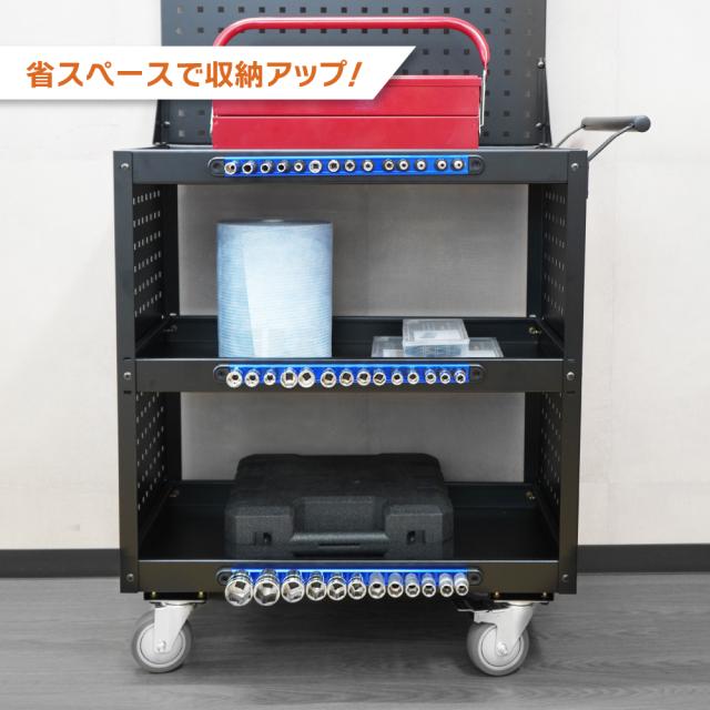 ソケットの整理整頓に!配置は自由にカスタム可能 ●ソケットを最大14個収納できるマグネットホルダー3本セットです ●1/4、3/8、1/2インチと3種類の差込角に対応 ●ソケットのサイズ別に収納できるので、必要なサイズを素早く取り出せます ●ホルダーは取り外しができ、差込角をミックスすることも可能 ●マグネットが裏面に付いており、キャビネットや工具箱などのスチール面に設置できます ●コンパクトなサイズ感で場所を取らずに収納できるので、保管場所にも困りません <取り扱い注意事項> - 磁気の影響の恐れがあるものは近づけないでください - 指などの挟み込みにご注意ください - スチール面の少ない場所、落下の危険がある天井などは設置しないでください - フックなどに掛けて使用しないでください - 直射日光や高温多湿な場所への保管は避けてください |