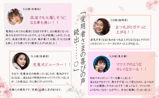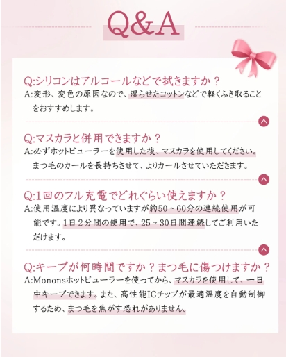 連続使用:フル充電で1日2分間の使用で、25〜30日間連続してご利用いただき、どこでもまつげくるん。お手入れ簡単:ホットビューラー本体とシリコンを湿らせたコットンなどで軽くふき取ればOK。