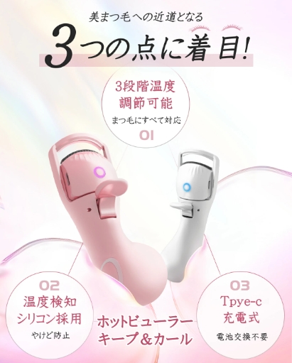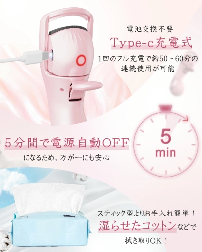 電池式から便利なtype-C充電式のホットビューラーに変更して外出先や充電できない場所でも使用できます。また、電源を入れてから約5分後に自動的に電源がOFFになるため、万が一電源を切り忘れたとしても心配なし、安全性が高いです!