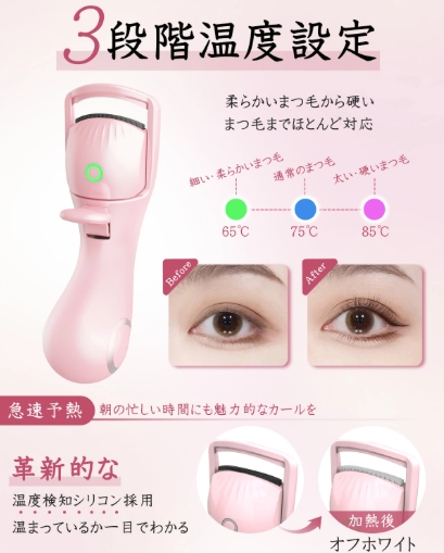 高性能ICチップが最適温度を自動制御、65度から85度までの三段階の温度設定が可能です。柔らかなまつ毛から硬いまつげなど、様々なまつげに対応できます。やわらかいまつ毛には低温の65度、通常のまつ毛には75度、まつ毛が硬い方には85度を選択してください(初めての方は低い温度から試していただき、お好みの温度で使用してください)。革新的な温度検知シリコンを採用し、ブラック→オフホワイトに変わると使用できるか一目でわかり、触ってやけどをしてしまったことを防止できます!