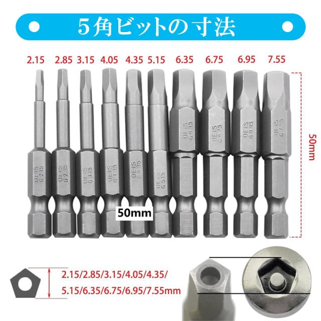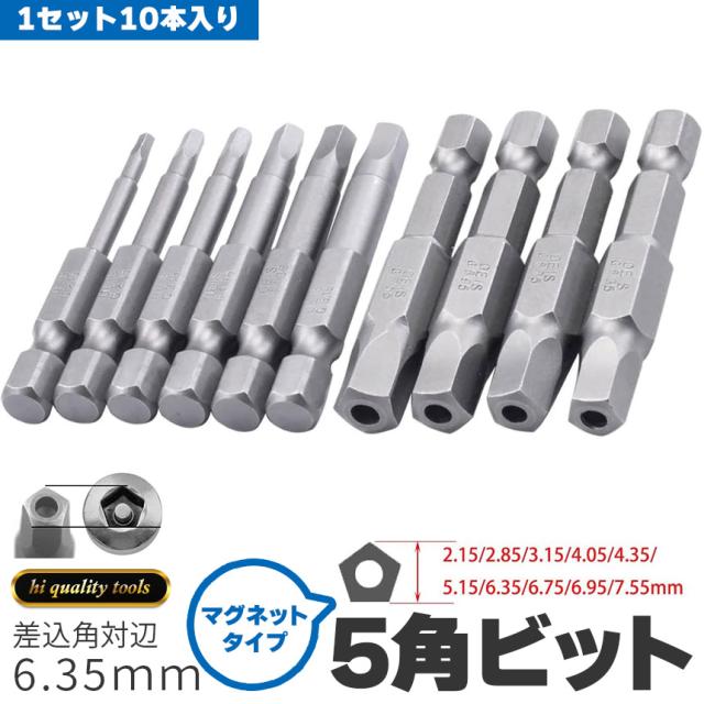 五角軸 ドライバービット10ピース 6.35mm 10サイズ入り 磁気 五角形 電動ドライバー ビットセット 精密ドリルビット 電気工具 ビットセット 電動ドライバー インパクトドライバー ドライバー